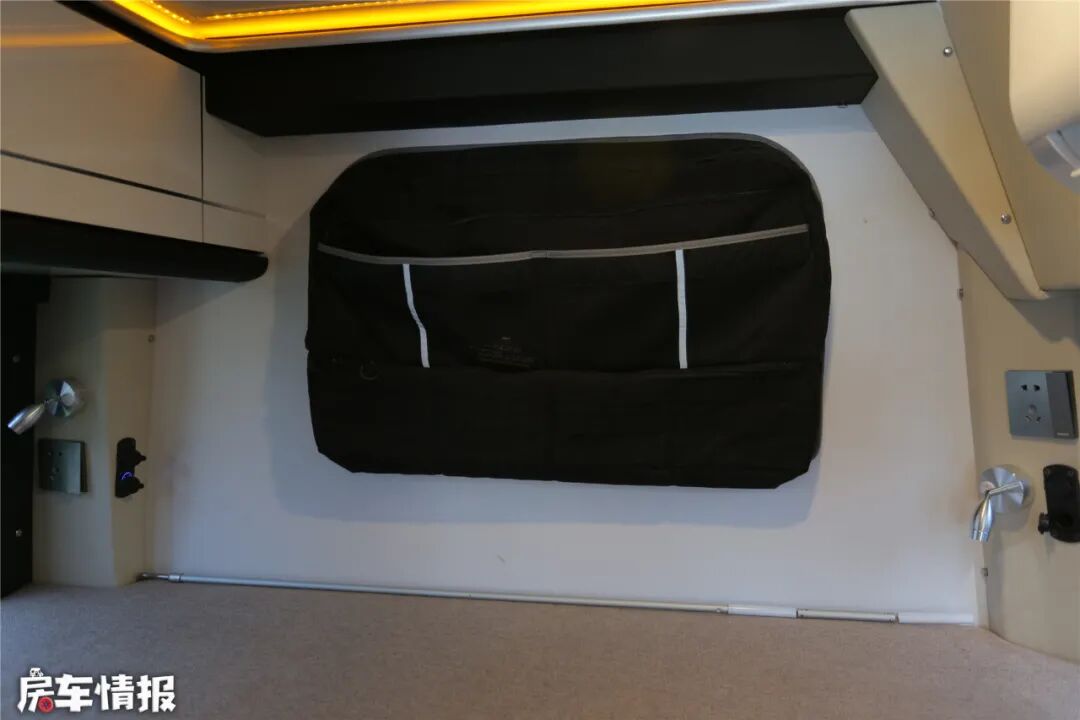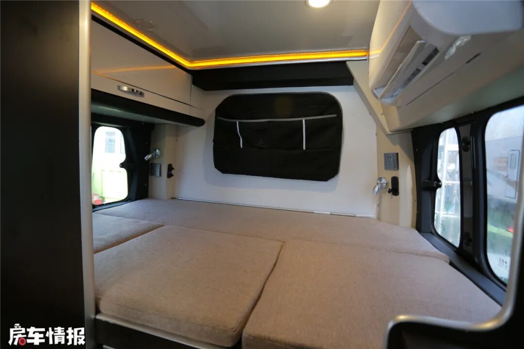 主休息区设置在车尾,采用固定双人床的布局,两侧都有采光窗,后面的蝴蝶窗在行驶中也能打开小缝,保持车内外空气对流。大床两侧都设置了LED阅读灯、220V电源插座和12V插口等,丰富了晚间生活。