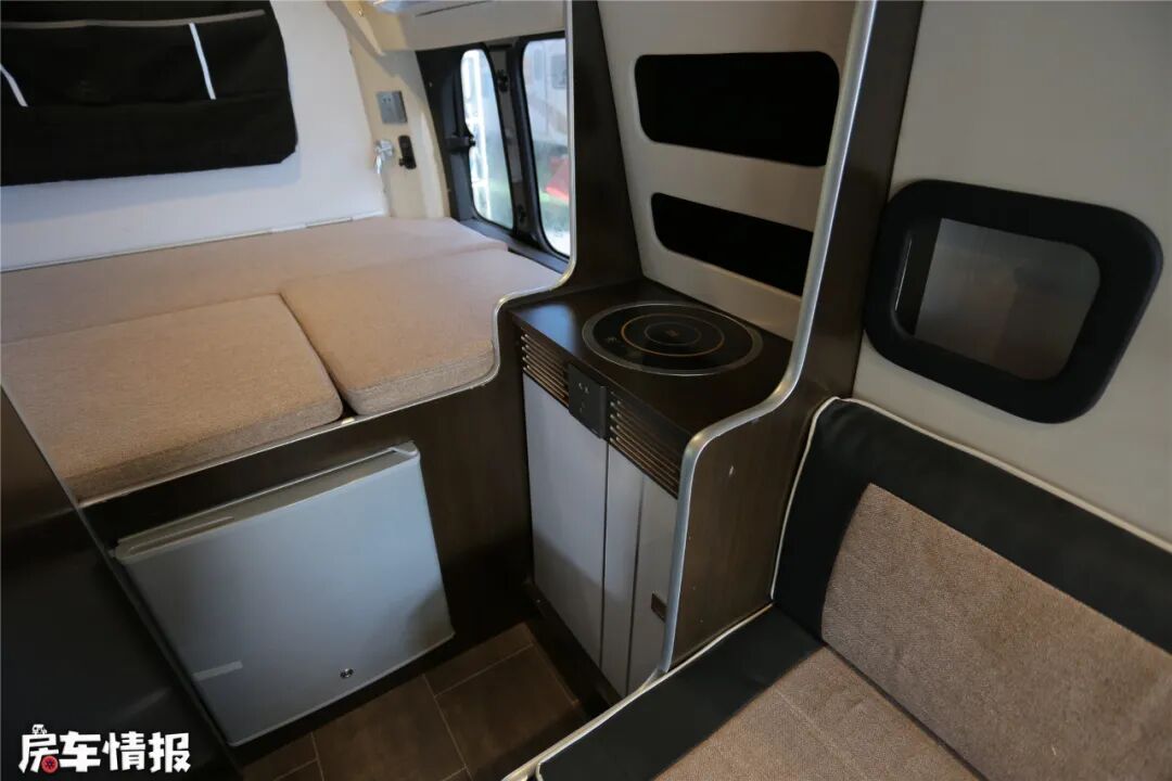 卡座再往里就是厨房区域了,这里的设施比较简单,提供了电磁炉,橱柜、220V外接插口和50L冰箱等,满足基本的烹饪需求。为了充分利用空间,冰箱放置在里车尾床的底部,不占用过道空间,非常人性化。