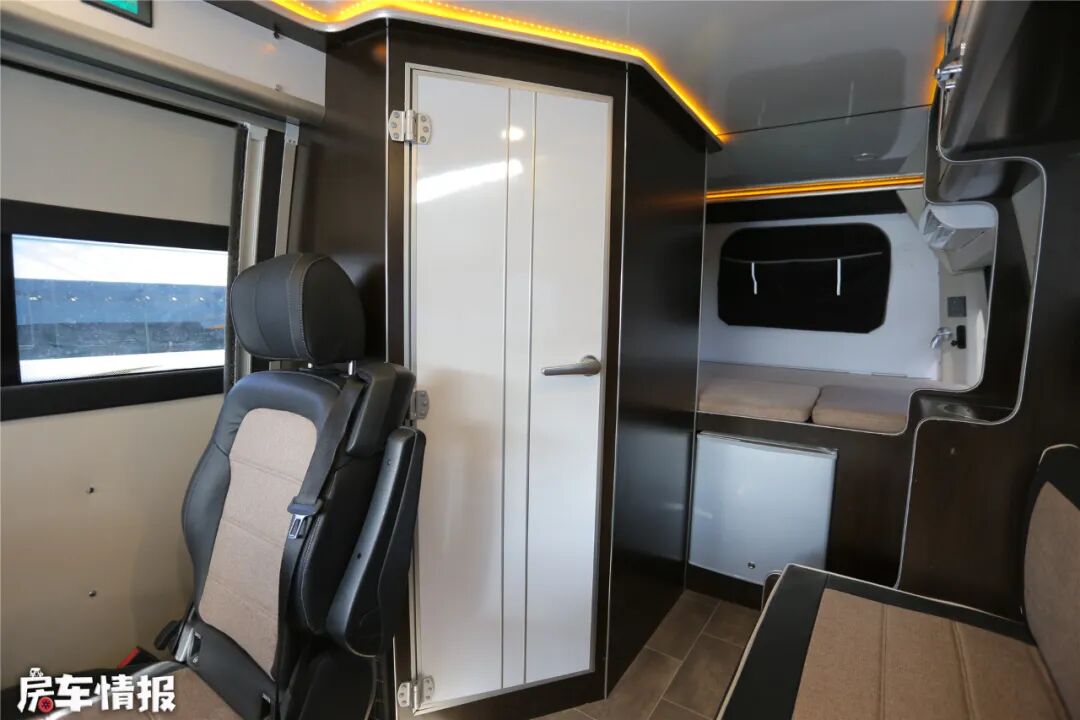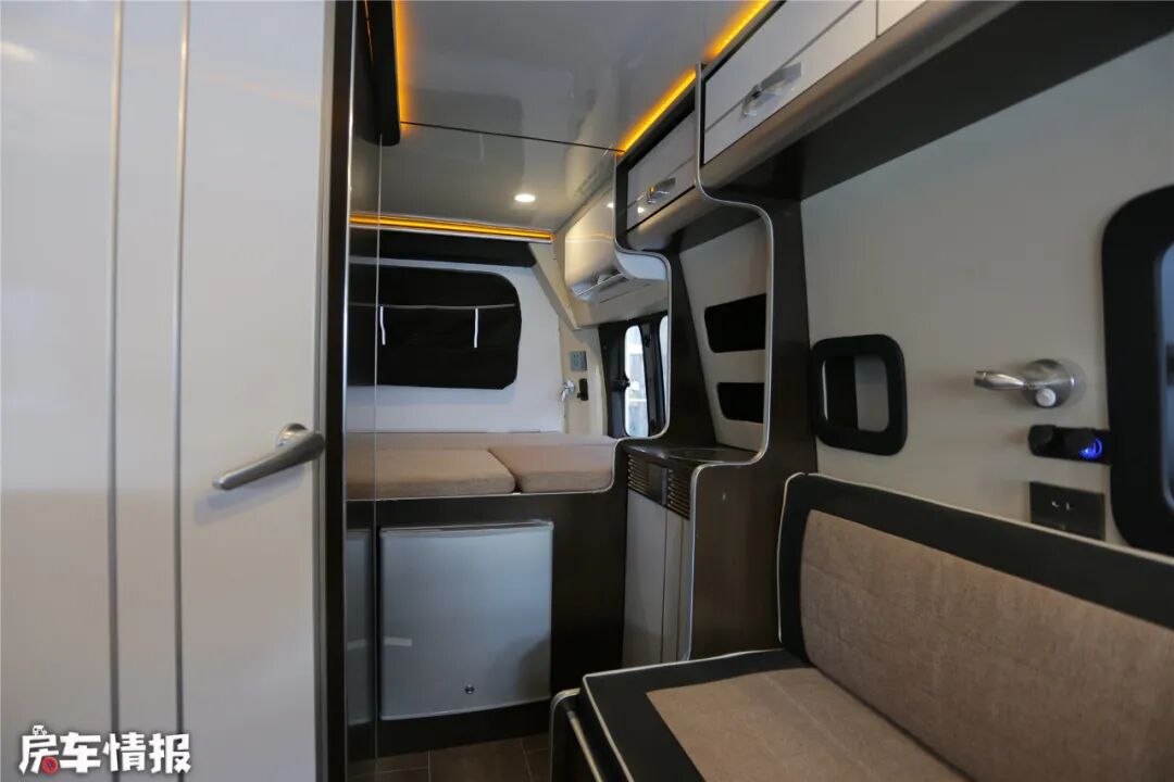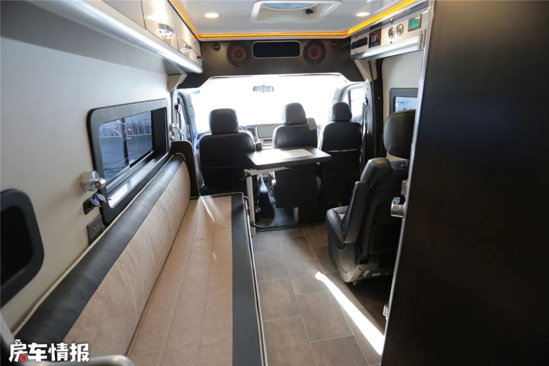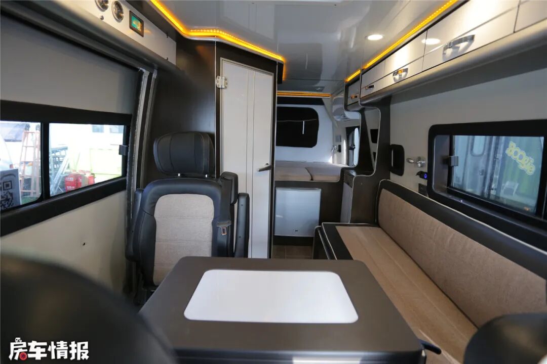 生活空间分为会客区、休息区和厨卫空间,由于车内是单卡座布局,显得空间非常充裕。车顶设置了换气扇,保持车内的空气流通。顶部设置了一排柜子,增加了房车的储存空间。整车都有暖色调的氛围灯,营造出家之温馨与浪漫。