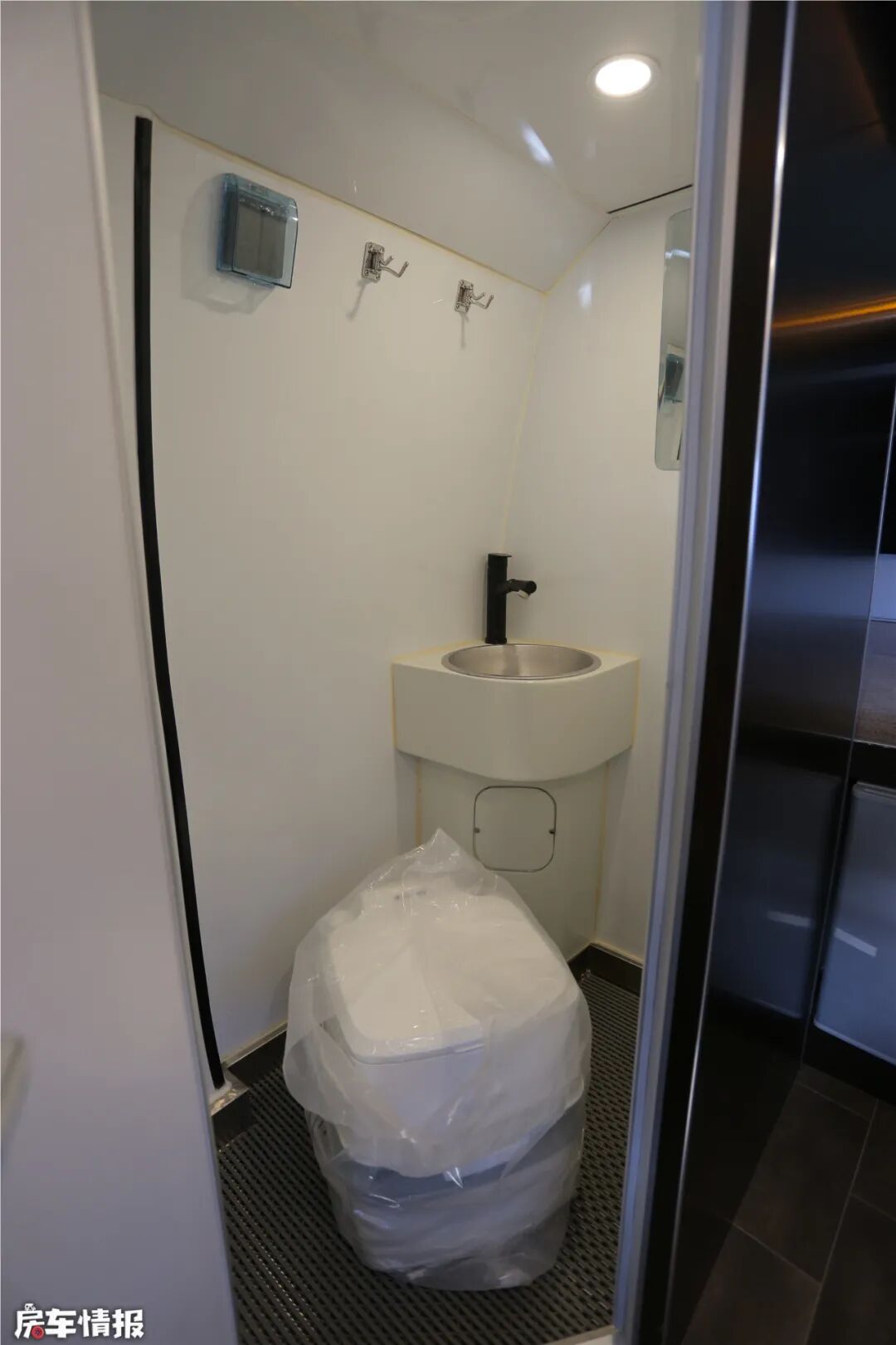 车尾转角处是卫生间,独立开门的设计,与其他功能区形成了物理隔离,整洁、卫生。内部提供了便携式马桶、洗手池、冷热水龙头、梳妆镜、挂衣钩、带防水罩的市电插座等设施,马桶可以随时移动,以便于腾出额外的储物空间。