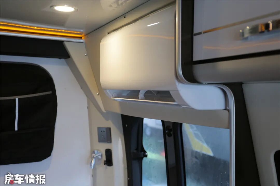 车尾还安装壁挂12V变频空调,节电、静音,与室外机分体,不会牺牲车身高度。车头还带有行车空调,可以为生活区同步冷、暖风,维持车内舒适的温度。车身还带有40L电热水器,提供源源不断的热水。