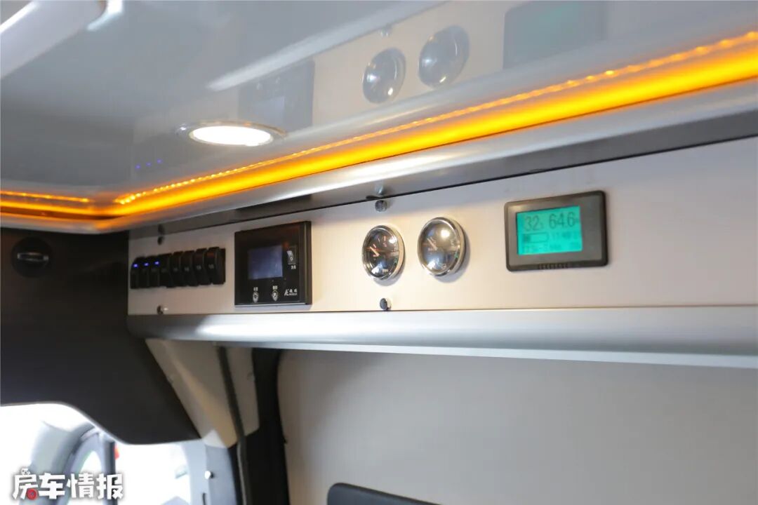 水电配置上,此车采用200AH 锂电池+2000W逆变器,水路上安装了110L清水箱+40L灰水箱满足一家人的水电需求。