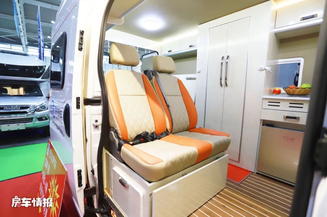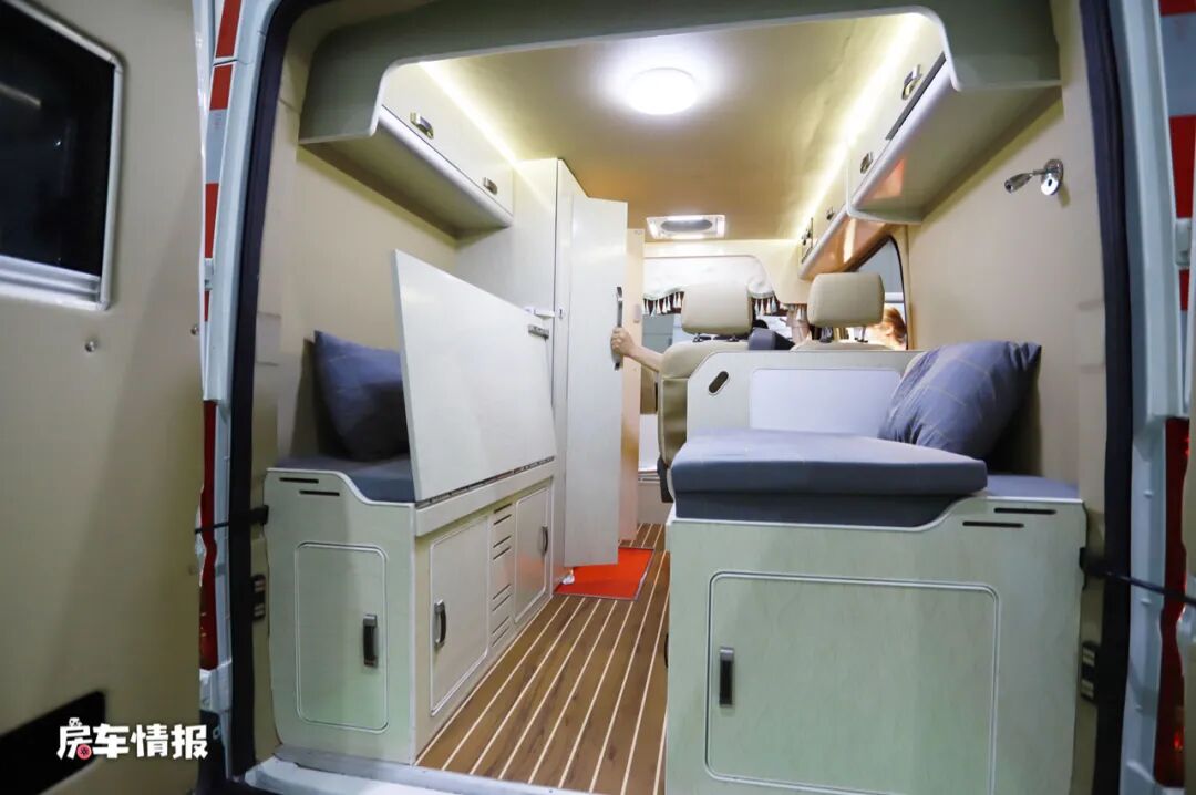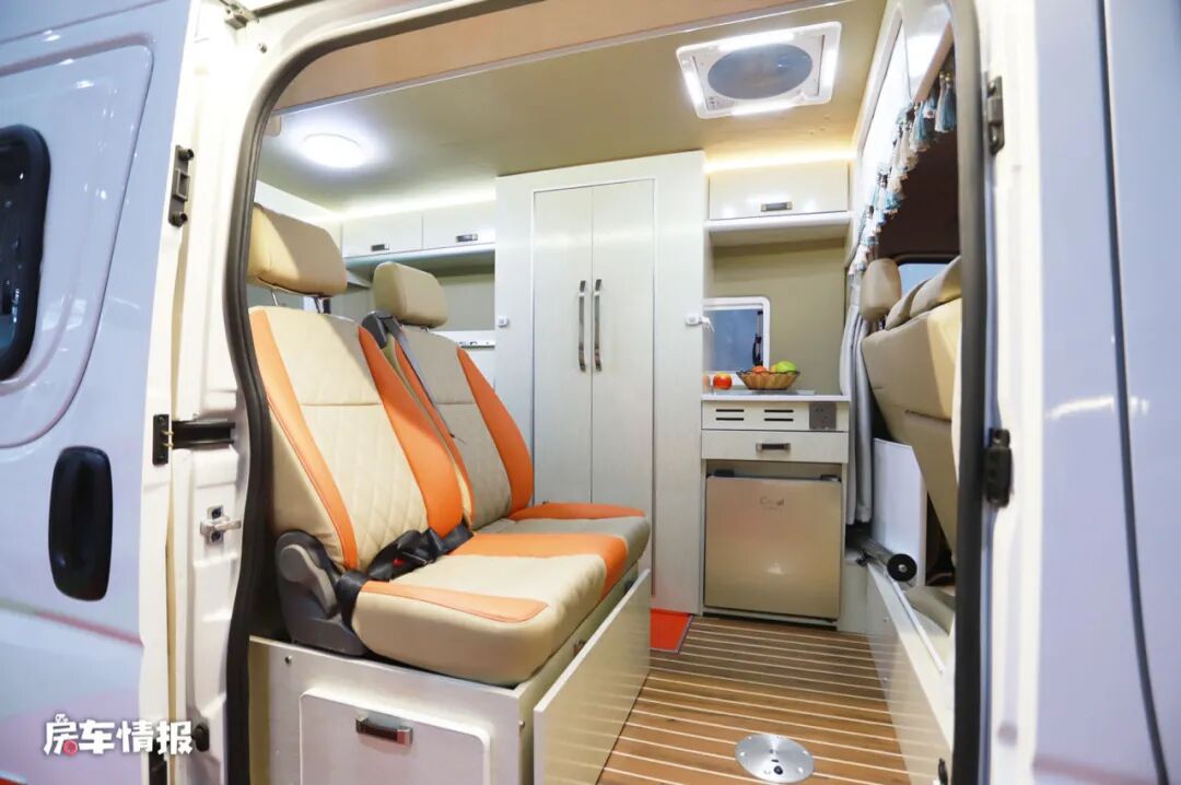 临近乘客门的地方设置了一排双人沙发,并配有安全带,平时行车时整车最多可以坐5个人。