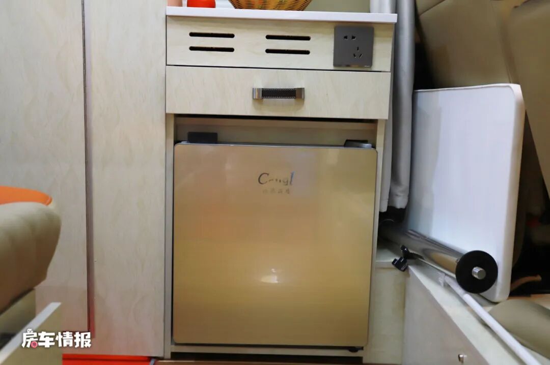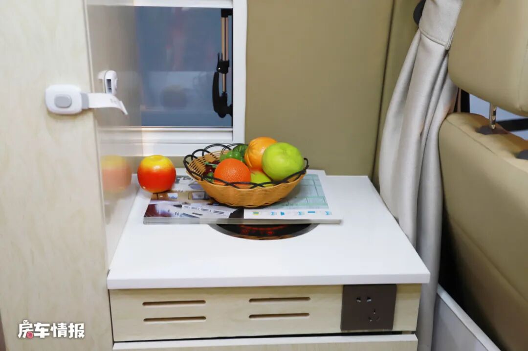 主驾驶座椅后面是一个小型的厨房区,台面上方提供了一个电磁炉,可以简单的烹饪做饭,下方带有50L的车载冰箱,平时可以存放一些瓜果蔬菜。