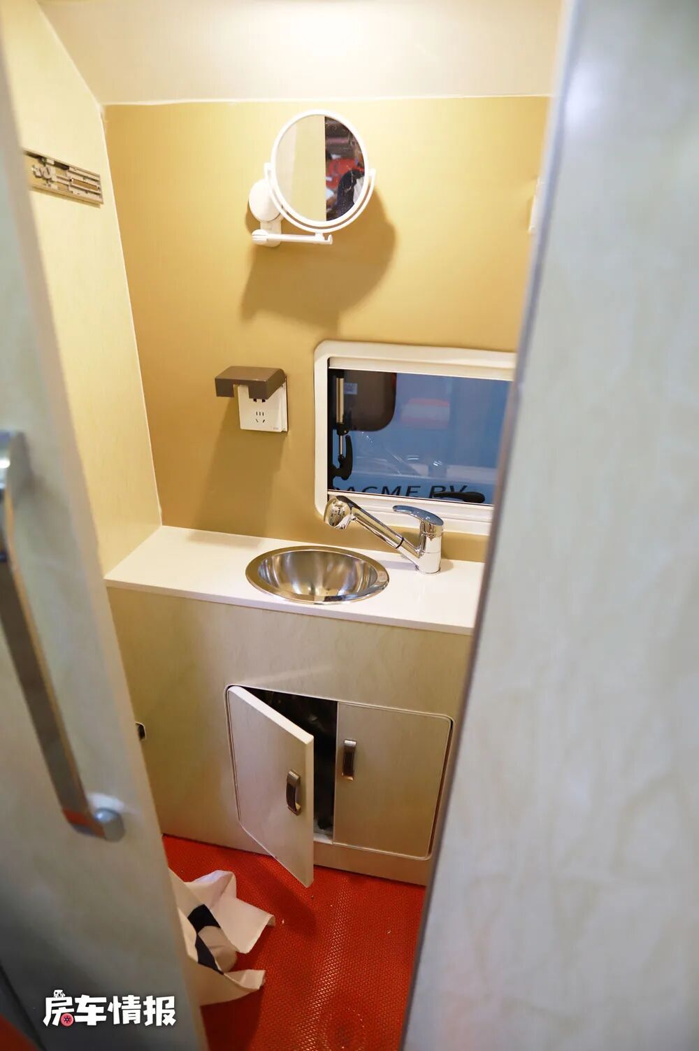 橱柜后方的卫生间设计非常的特别,整体采用了一个抽拉式的设计,平时折叠起来也不影响其他生活空间,使用的时候就可以将卫生间的门向外推开,形成一个简单的淋浴区,内部配置了水盆、梳妆镜以及便携式马桶,可以满足基础的洗漱需求。