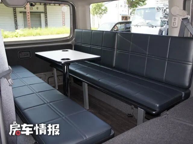 车厢尾部提供了两张对坐式的长条沙发,平时驻车时结合中间的小型餐桌可以形成一个简单的会客就餐区域,虽然横向的空间并不是很理想,但是吃个饭看个电视还是不成问题的。