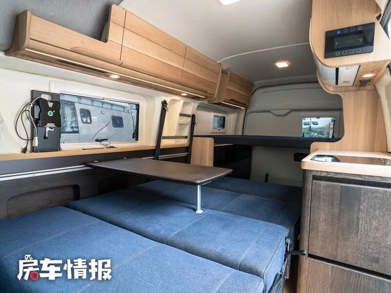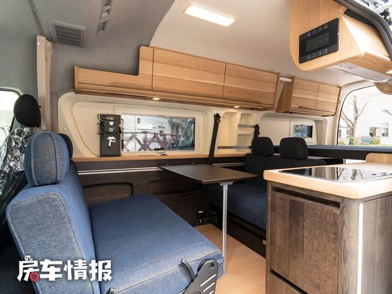 五人对卡座式的大沙发看起来非常的宽敞,而且也采用了更加亲肤透气的材质,坐起来也会比较的舒适,中间的餐桌是带有滑轨的,可以拆卸移动,白天大家坐在这里吃饭聊天都还不错,当然平时行车时也可以全部面向前方,所以整车在行驶过程中最多可以乘坐7个人。