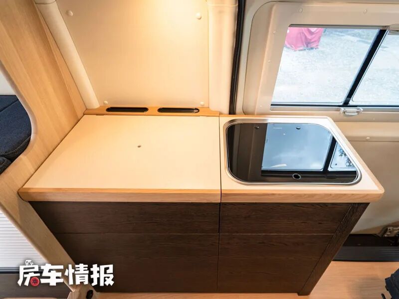 临近乘客门的位置打造成了一个厨房操作台,侧面还带有可拓展的小桌板,平时可以备菜或外接其他厨用电器使用。