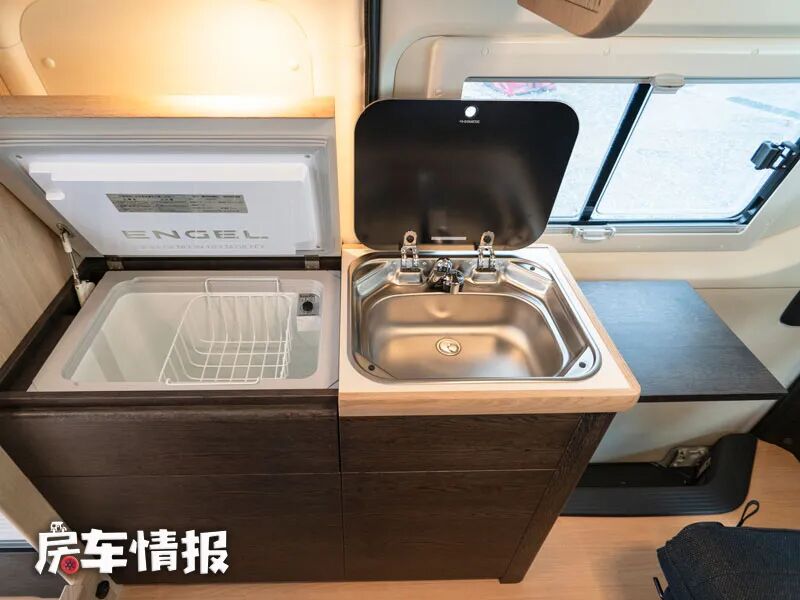 桌面上隐藏了一台上翻盖式的车载冰箱,以及一台带盖的不锈钢洗菜盆,方便平时使用,下方还提供了储物空间,也可以存放一些厨用工具。