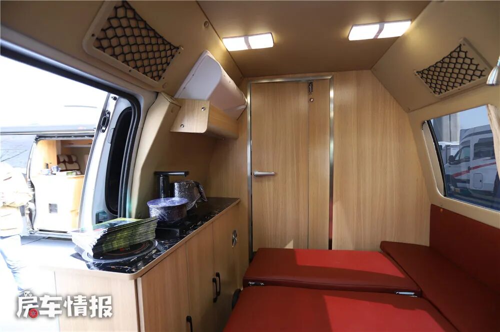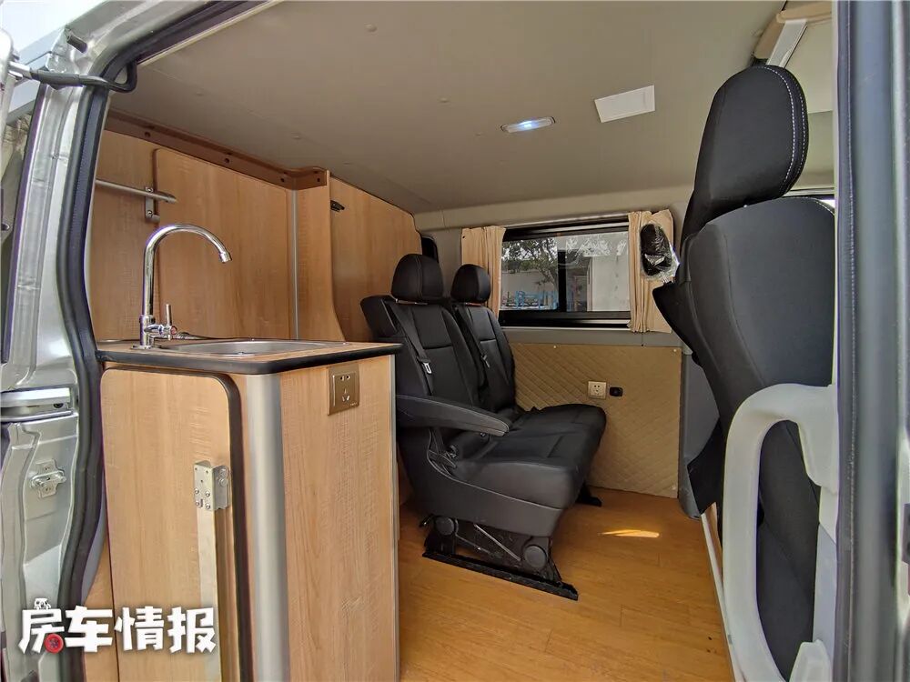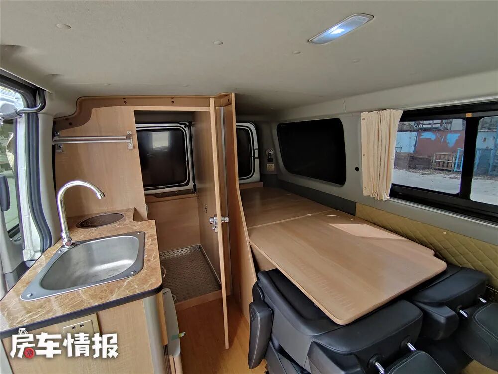 位于侧滑门处提供了一组厨房设备,包括电磁炉、洗菜池、房车专用冰箱等,基本上能够满足周末露营的时候做一些简餐以及冰镇饮料和保鲜食物。