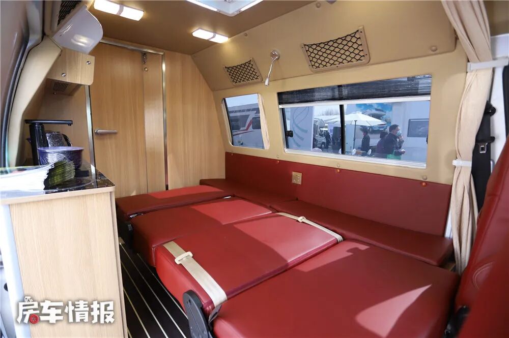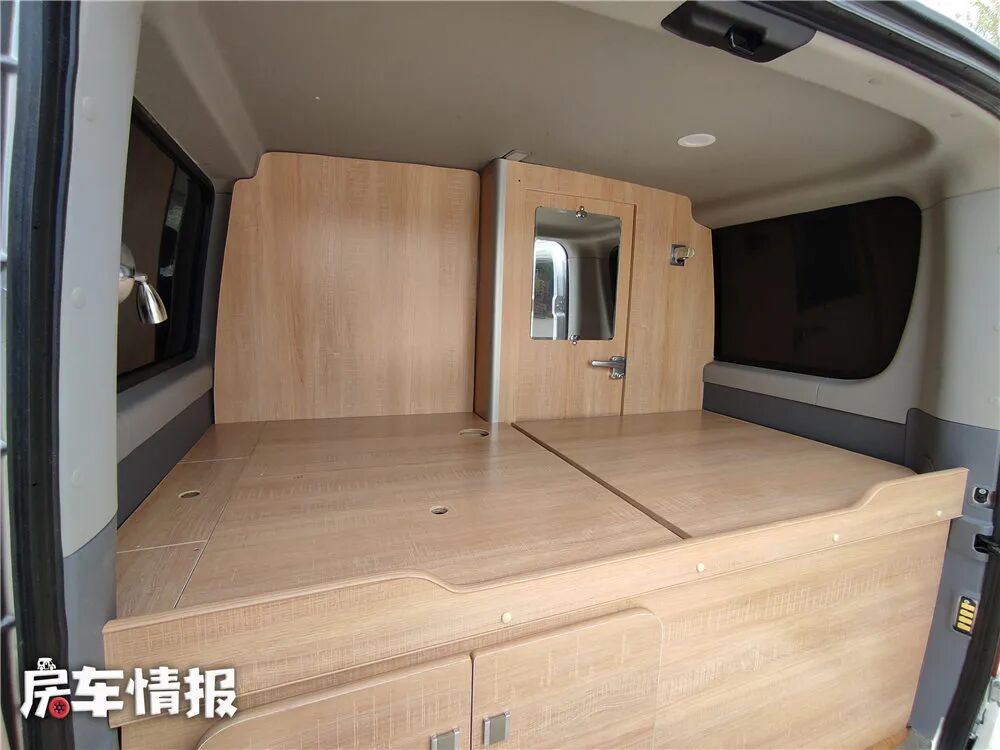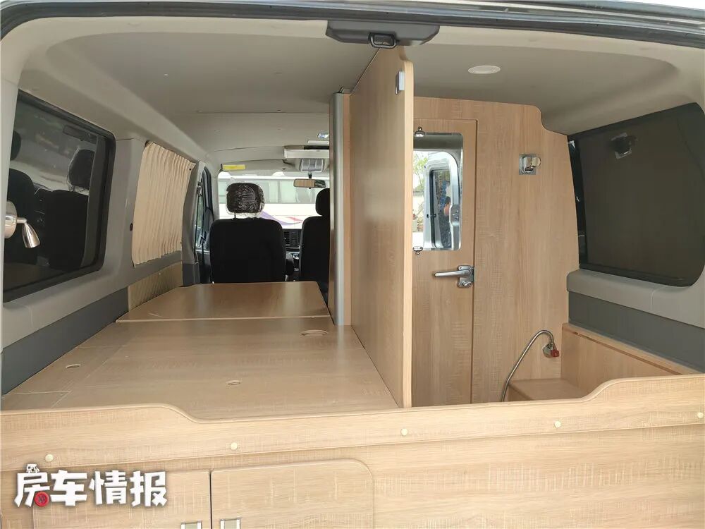这时候如果想休息的话怎么办呢?可以将前方双人座椅靠背放平,变成一张纵置床铺,可以睡下一大一小。当不使用我卫生间的时候,还可以把翻板放下,此时车尾就变成了一张横置床铺,同样可以满足一大一小休息。