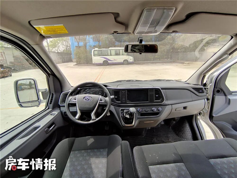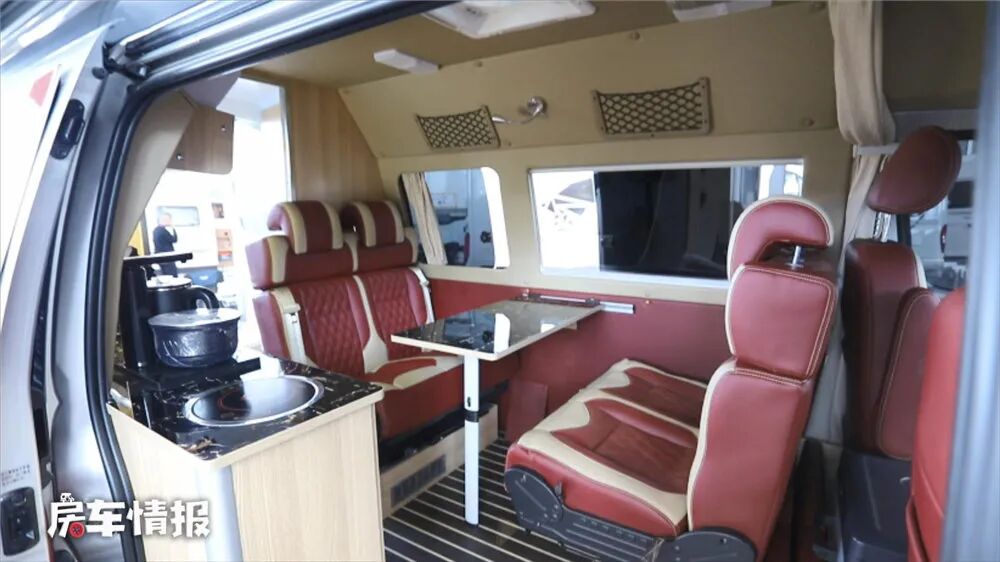 来到后方生活区,前方为双人座椅+餐桌的布置方式,双人座椅采用的了乘用车座椅,可以调整靠背角度和坐垫前后位置,提升了日常乘坐的舒适性,不过有一点需要注意,由于采用低顶车身,生活区的高度并不是很高,身高1.6米以上的 人就不能直立了。