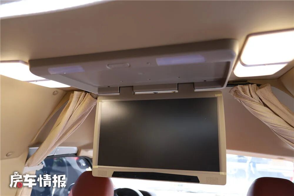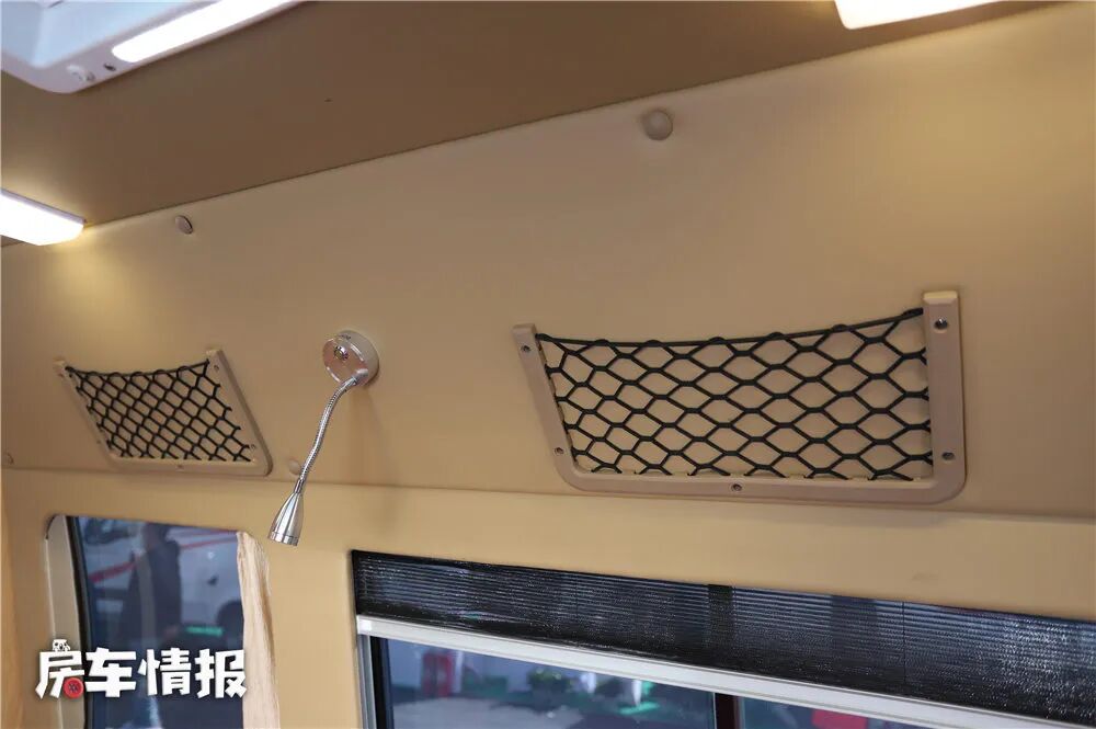位于车顶部还提供了吸顶电视、储物网兜以及车顶换气扇,旅行中便于把零食、外套等小件物品存放其中,也不用担心行车中乱晃产生异响。