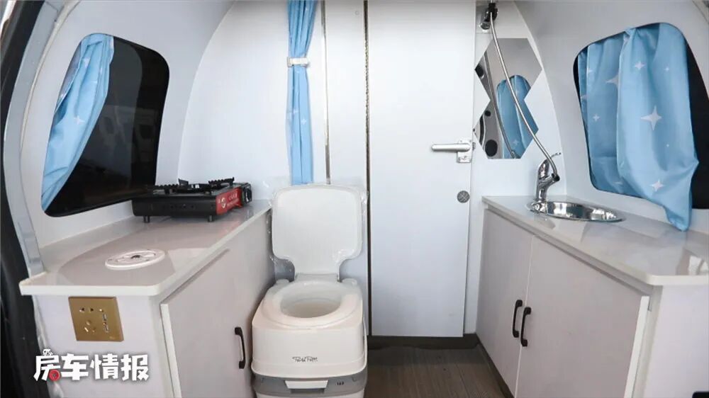 来到车厢尾部,是一个完全独立于前方的卫生间区域,这里提供了便携式马桶、洗手池、净水箱等,当外部天气不好的时候,还可以在尾部使用卡式炉做饭,这样尺寸的一辆房车里能有这样一个独立空间,挺让人意外的~