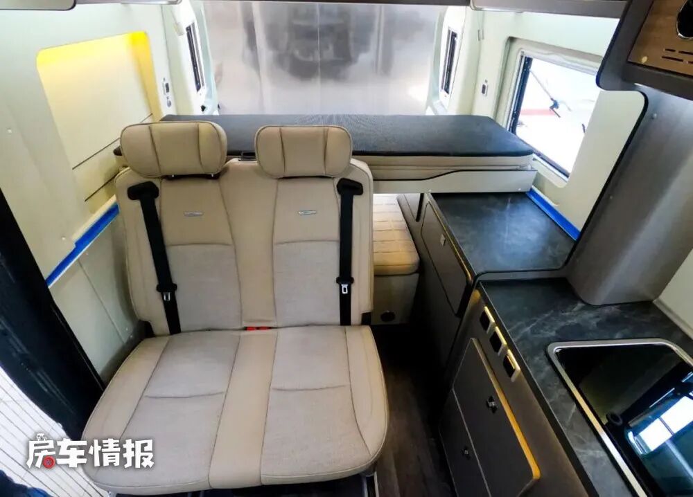 主驾驶座椅后方仍然是全车的厨房区,桌面上隐藏了双孔燃气灶和不锈钢的水槽,空间更加紧凑,下方同样配置了一台65L的车载冰箱,满足出行的基本烹饪需求。