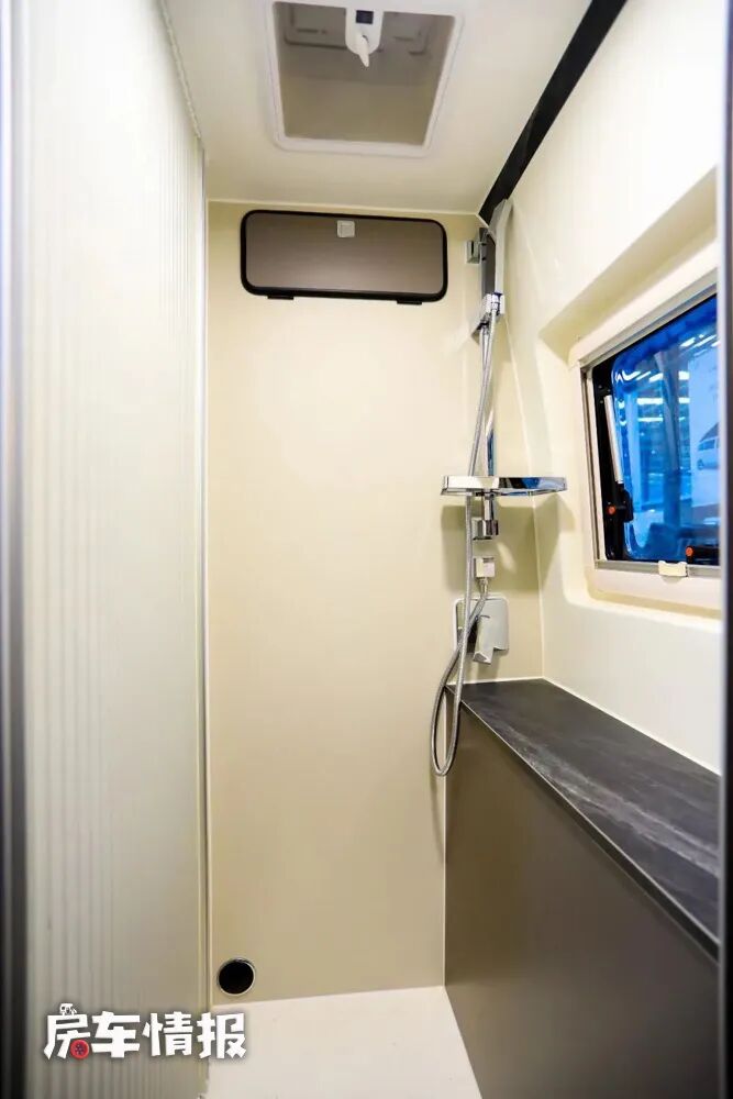 车厢尾部一侧是全车的独立卫浴室,配置了淋浴花洒和便携式马桶,满足更多的出行需求。同时全车匹配了5000W的燃油暖风热水一体机,即便在冬天也可以舒舒服服的洗个热水澡。