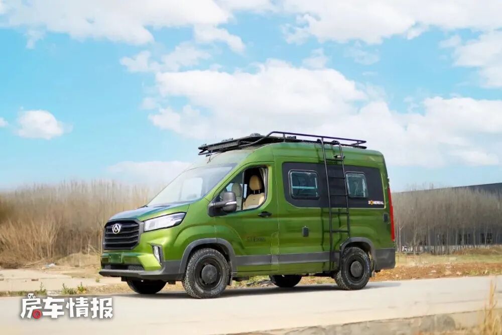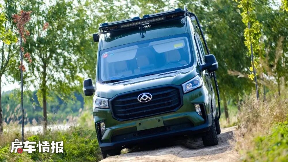 接下来我们先看看这款景宴栖510 A版猎装款。这款车的外观涂装采用了亮绿色,车身左侧带有爬梯,顶部还带有行李架,从整体上就突显了越野的气息,熏黑的前中网设计以及顶部的越野探照灯,更加贴近猎装的定义。
