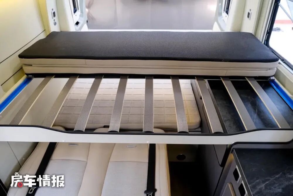 平时晚上需要休息的时候,不仅可以选择下方由会客沙发展开形成的尺寸为1950mm*1000mm的沙发床,也可以选择隐藏在顶部的电动升降单人床,尺寸为1600mm*900mm,上下铺的设计可容纳两个人使用,所以整辆车更适合两个人出行选择。