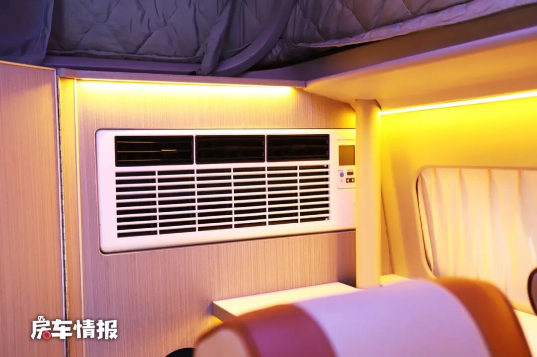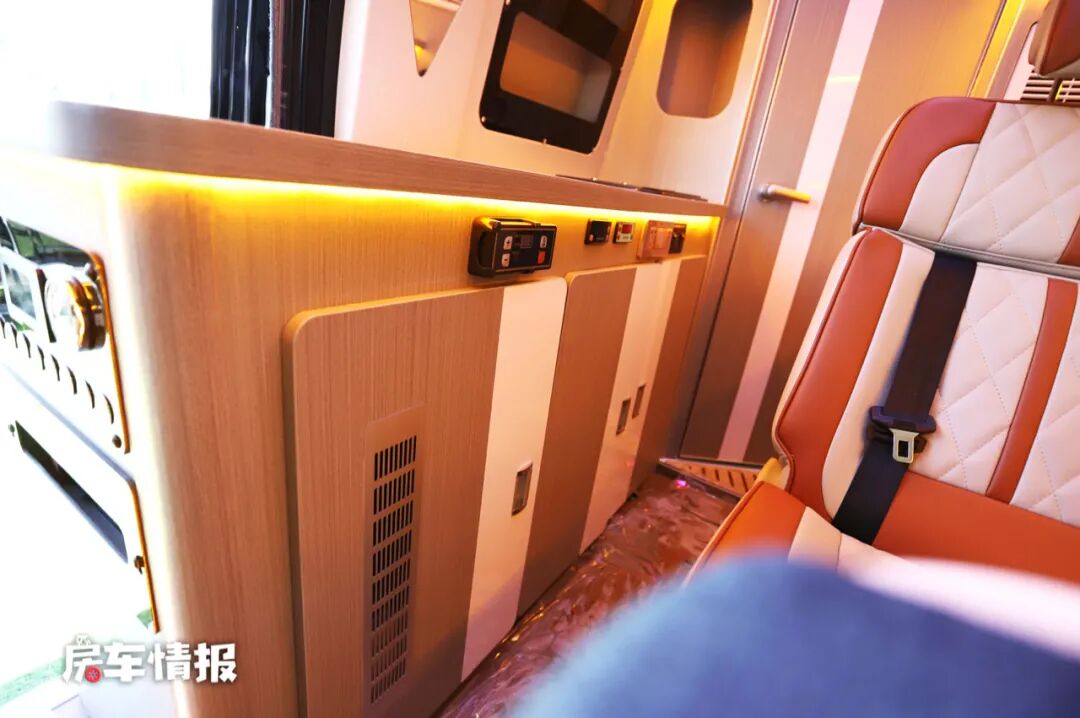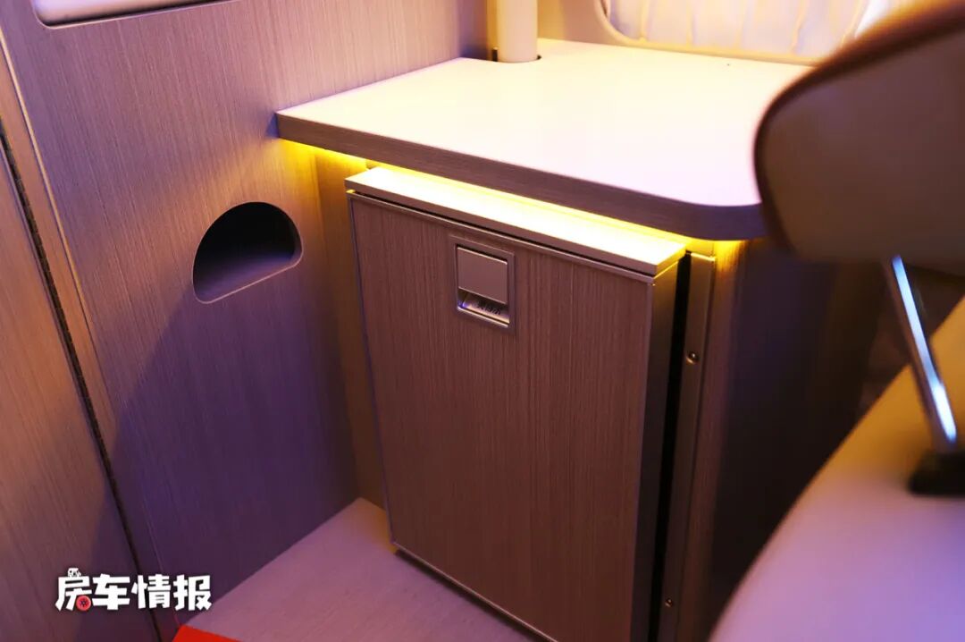 乘客区沙发后侧放置了一台小型的车载冰箱,上方带有空置的台面,平时可以放一些东西,但是行车时要固定好,上方是一台空调。