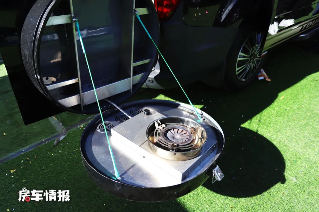 打开后车尾门,还提供了一个外置的厨房区,其实包含了一个外置的柴油灶,但是因为这款房车是汽油车,所以还另外配备了一个独立的柴油箱,补给柴油灶。