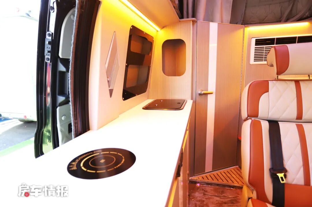 临近乘客门的一侧是厨房区,台面的尺寸非常的大,最左边配备了一个电磁炉,最右边提供了一个翻盖的洗菜池,中间有大块空置的台面,可以切菜也可以加装小型厨用电器,非常的实用且人性化。