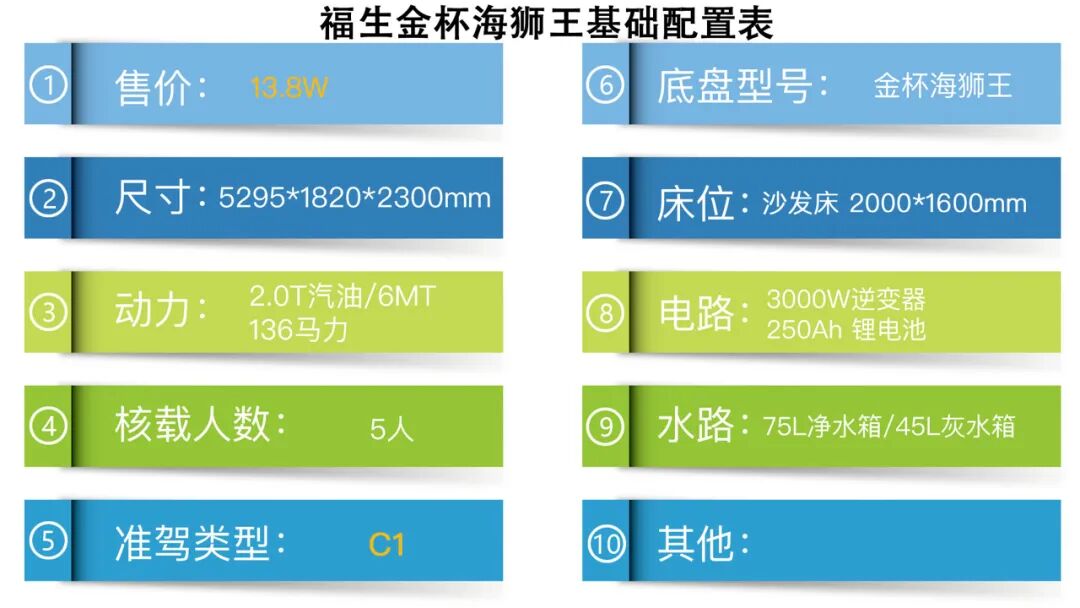 这款房车是来自于福生的一款B型房车,是基于金杯海狮王的底盘打造而成的,全车的长宽高尺寸为5295*1820*2300mm,不到5.3米的车身长度要比我们一般常见的其他房车短小了很多,又加之整体的车身高度只有2.3米,所以说内部空间也因此会在一定程度上受到局限。