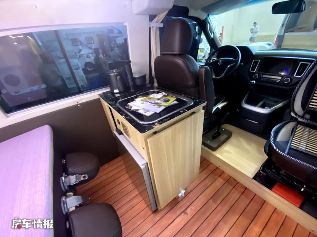 与其他房车不同的布局是这辆车将厨房操作台移至到了主驾驶的后方,桌面上带有电磁炉和带盖的不锈钢洗菜池,下方镶嵌了一台车载冰箱,侧面提供了一张可拓展的小桌板,平时可以充当餐桌使用。