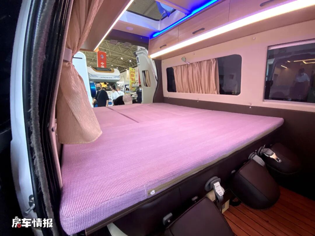 车厢中部提供了三张沙发座椅,所以整车在行驶过程中最多可以坐5个人,但是如果真的是5个人使用,那肯定是不能满足居住需求的。晚上睡觉的时候,就可以将座椅放倒,把床垫铺在上面,形成一张尺寸为2000*1600mm的双人沙发床,可以容纳两个人睡觉休息的双人沙发床。