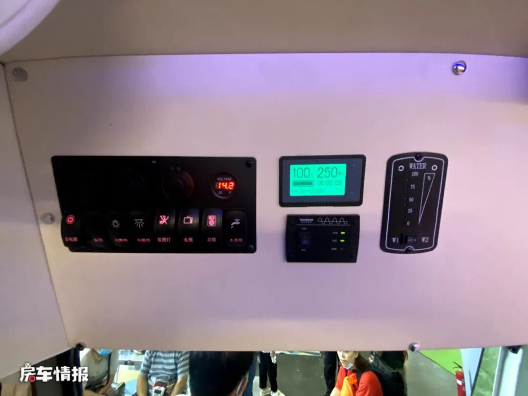 水电方面,这款房车搭载了一台3000W的逆变器,提供了250Ah的锂电池;水路上则提供了75L的净水箱和45L的灰水箱,水电的配置并不是很高,所以并不太适合远途的出行。
