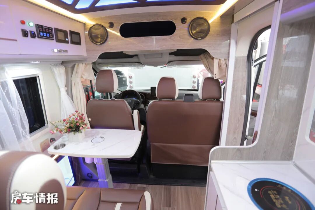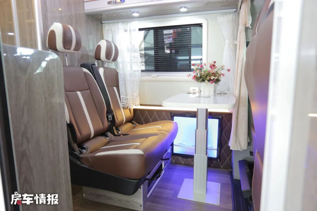 在乘客门正对的地方还是设计成了由一排双人乘客座椅+升降餐桌组成的会客区域,皮质软包的座椅提升了长时间驾乘的舒适度,同时还配备了两条安全带,结合驾驶室内一主两副座椅的设计,所以整车在行驶过程中最多可以坐五个人。