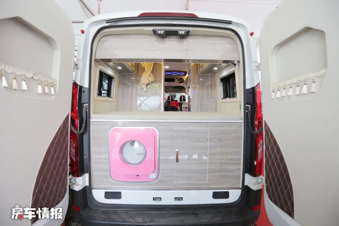 打开尾门还可以看到隐藏在双人床下方的一台mini洗衣机以及旁边带有柜门的储物舱体,虽然柜门不大,但是内部的空间还挺宽敞的。