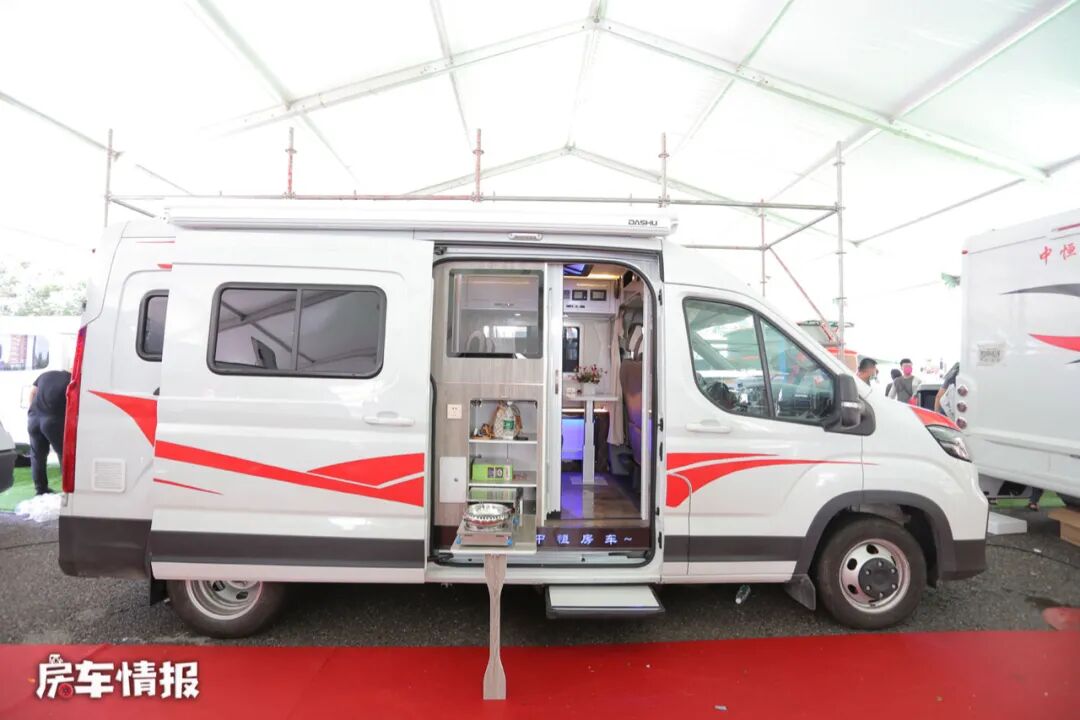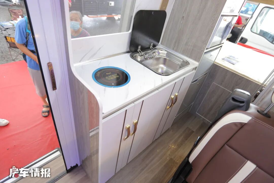 车身以白色为主,搭配红色的条纹,非常的简约低调,车身右侧上方配置了遮阳棚,下方乘客门处的厨房操作台外侧还提供了一个外置的抽拉式燃气灶以及外置翻板,上方还带有置物架,可以放一些烹饪用的调料瓶,平时天气好的时候也可以选择在车外进行烹饪。