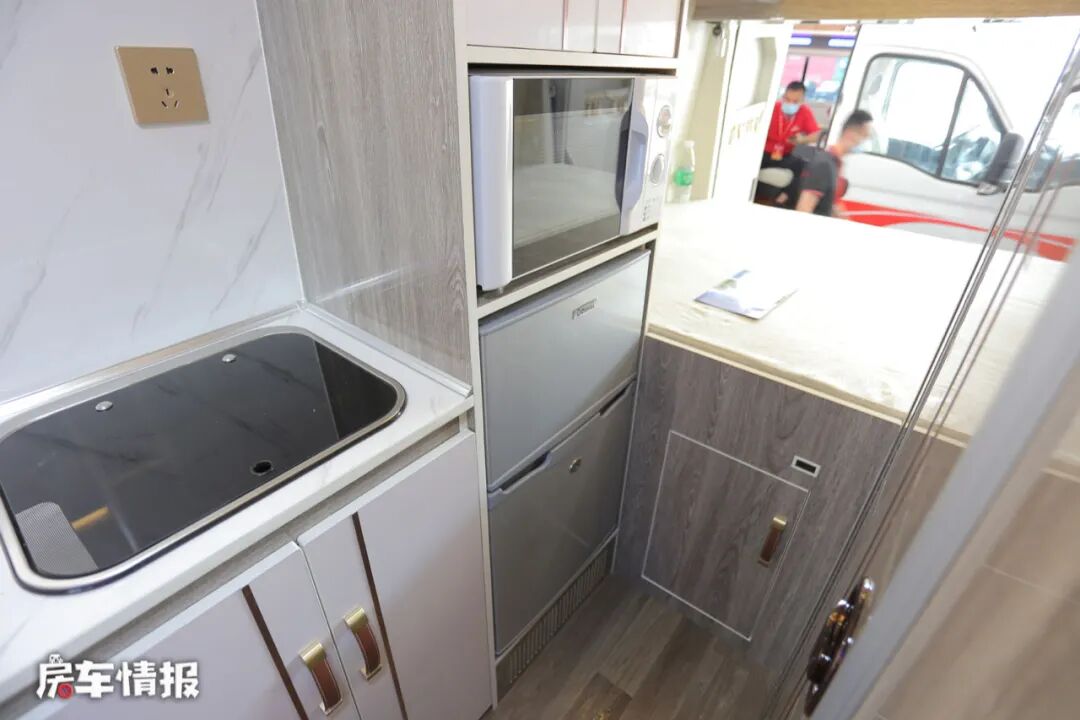 临近乘客门后方的厨房区也是一个标准的设计,长条形的操作台台面上带有电磁炉和不锈钢水槽,后方则提供了微波炉和一台85L的冰箱,满足平时生活中的烹饪需求。