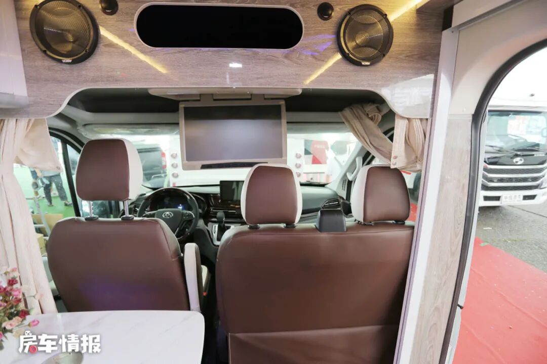 此外,全车在驾驶室的顶部还配备了一台19寸的吸顶电视,结合音响,可以带来更好的影音视听效果,同时也满足平日的娱乐需求。
