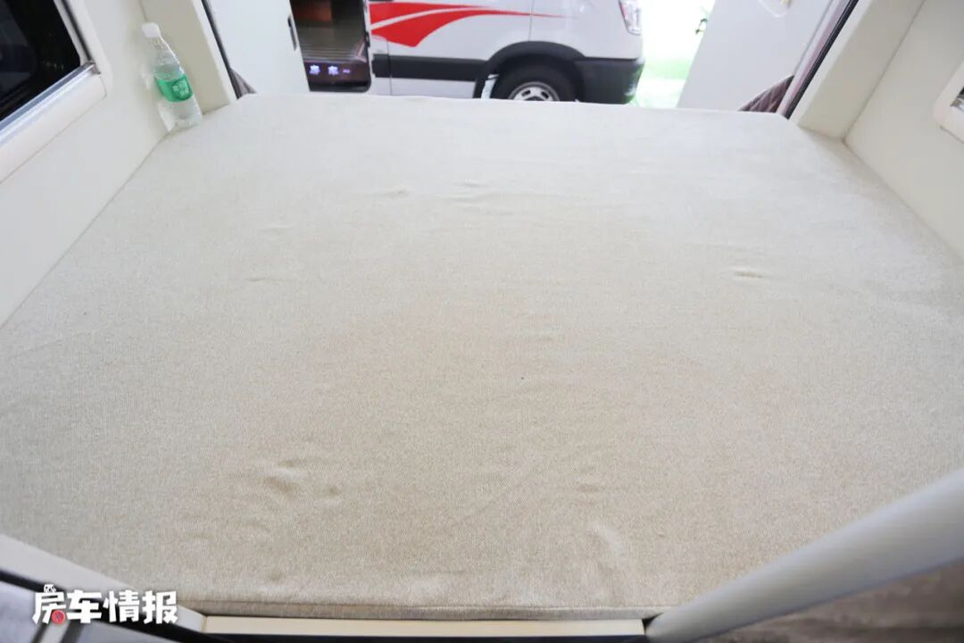 而整车的休息区则采用了横置双人床的设计,整体尺寸为1800*1300mm,也可以满足两个成年人的睡眠需求,床头床尾处顶部还提供了多个储物吊柜,可以存放一些平时换洗的轻薄衣物。