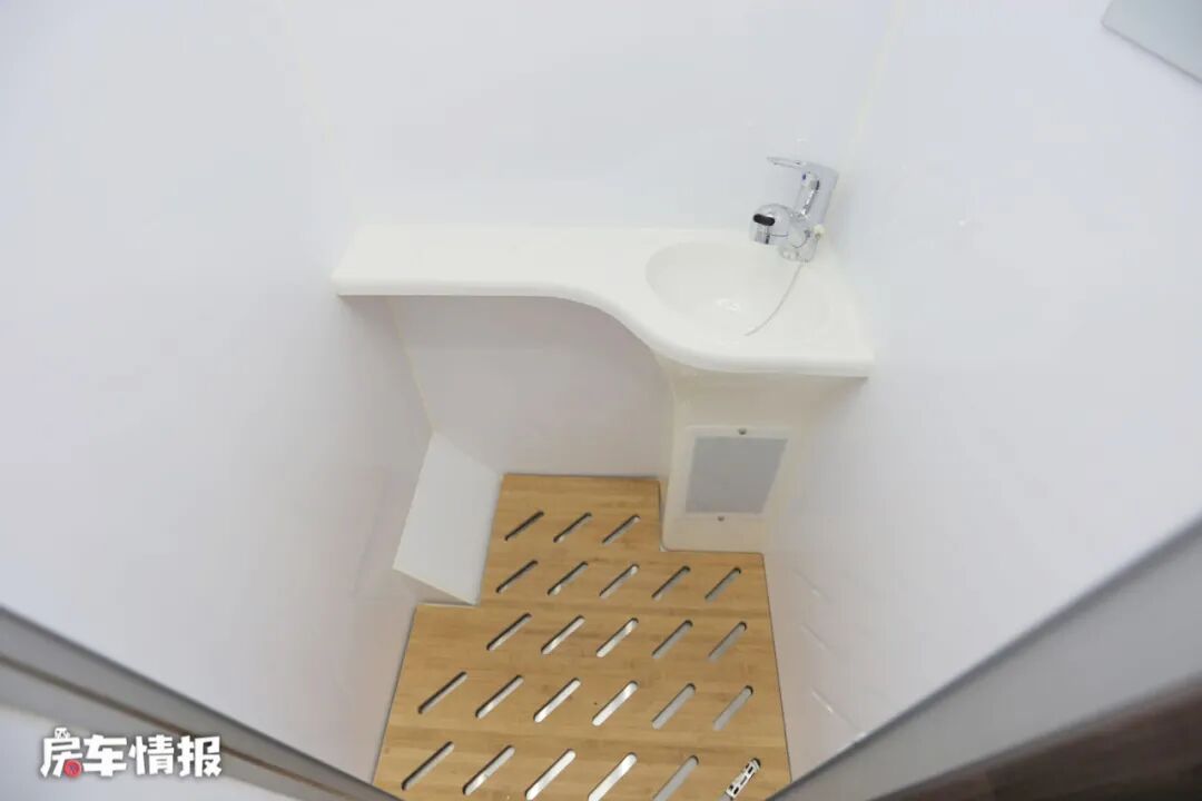 乘客区后方的卫生间采用了独立一体式的设计,提供了便携式马桶、洗手台、抽拉式淋浴花洒、梳妆镜和换气扇,也可以满足出行的基本洗漱需求,而便携式马桶使用起来更加的灵活方便。