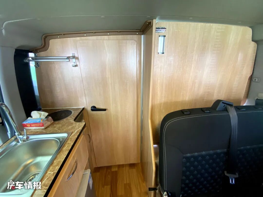 厨房操作台的整体尺寸还是比较偏小的,带有不锈钢的水槽以及电磁炉,下方还嵌入了一台30L的车载冰箱,虽然尺寸不大,但是也可以满足出行基本的烹饪需求。