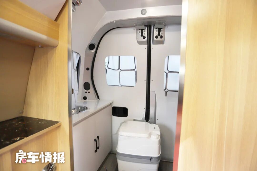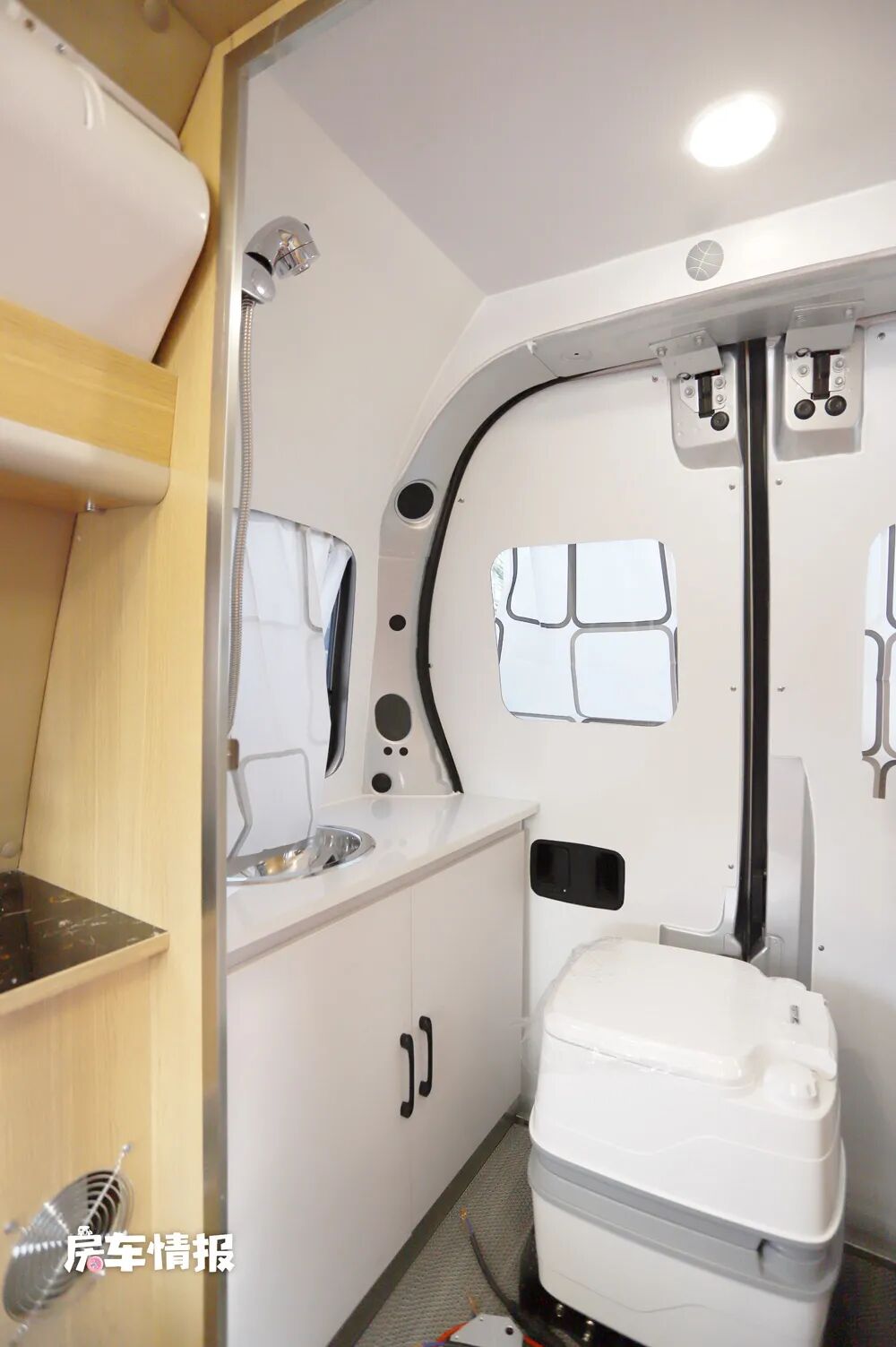 车厢的中部用木质挡板作为隔断,分隔开了尾部的卫浴室,卫浴室的横向空间还是很大的,提供了一个便携式马桶,淋浴花洒和盥洗台,平时淋浴时可将马桶拿走,增大内部的空间,只不过因为内部高度有限,洗澡的时候可能会感觉比较压头。