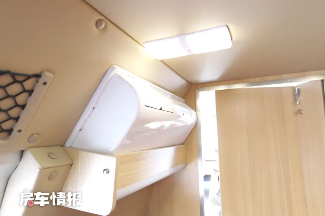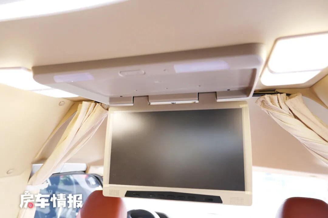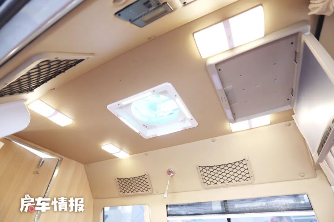 这款房车在车厢的顶部还配备了一台换气扇,并提供了一台折叠的液晶电视,平时可以坐在沙发上看看电视追追剧,满足娱乐需求。