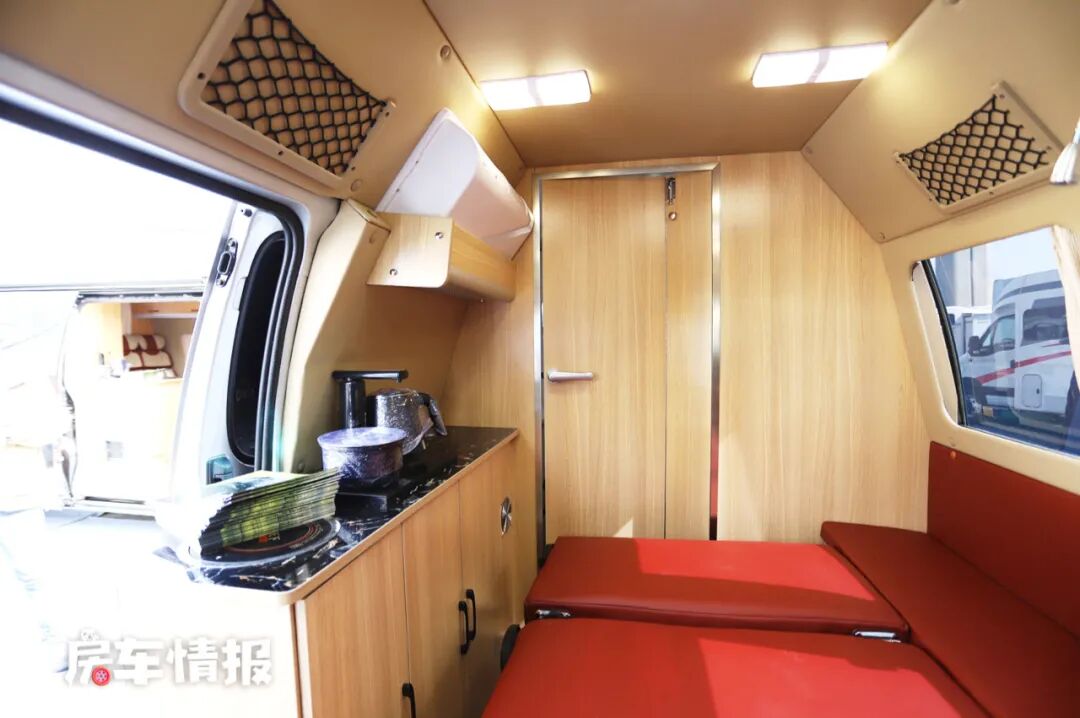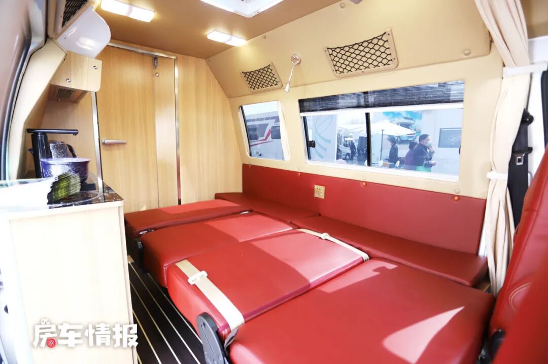 车厢内部的装饰颜色以红色和米黄色为主,空间非常的紧凑,内部的高度只有1620mm,对于身高比较高挑的人来说,可能直身都比较困难。