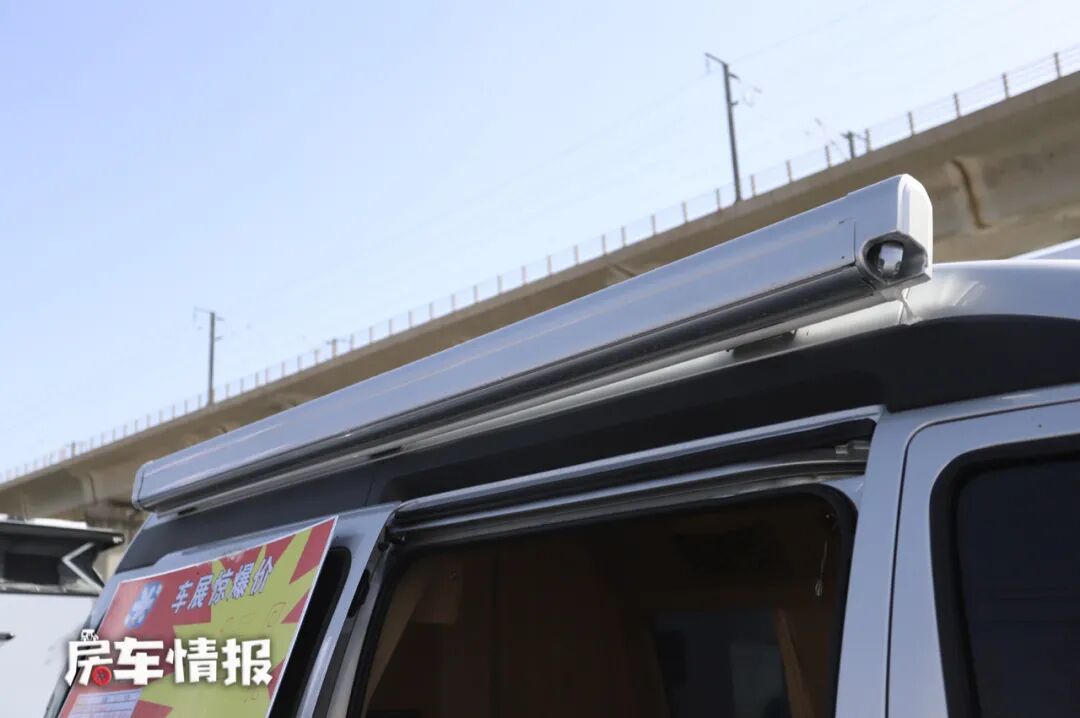 车身右侧上方提供了一个手动的遮阳棚,尾部提供了爬梯。