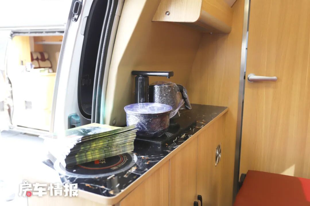 临近乘客门的一侧是一个小型的厨房区,横向的厨台面积倒是挺长的,不仅提供了电磁炉和洗菜池,最右边还有空置的台面,可以放一些烹饪材料或者后续加装厨房电器。