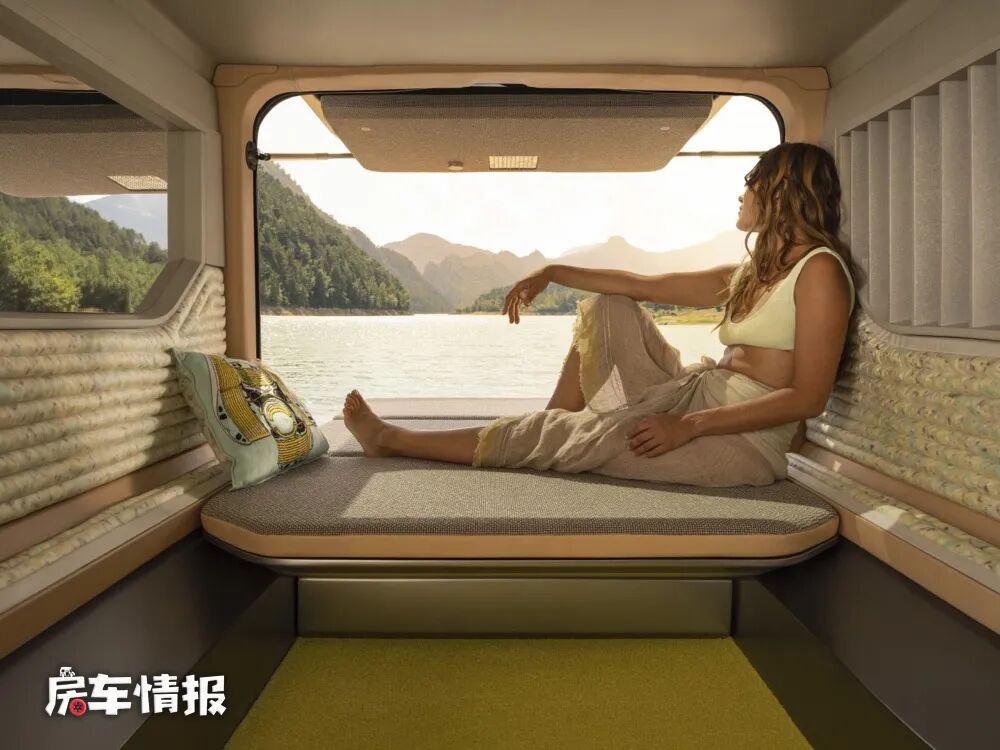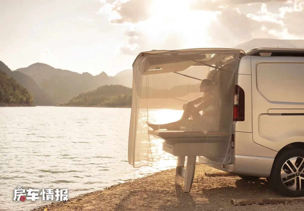 与带有厨房区的设计不同的是,也是这款车型比较特别的设计,车厢内部的尾床是可以向外拉伸的,罩好防蚊帘就可以坐在车外欣赏美丽景色了。
