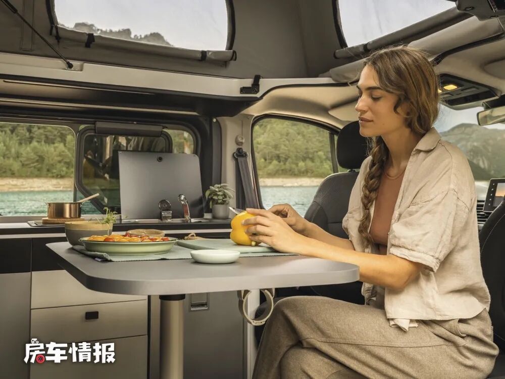 从车身右侧进入车厢内部,可以看到整个空间虽然不是很大,但是很规整,第二排座椅带有安全带,平时行驶上路时也可以做人,当驻车时则可以和前方的主副驾驶座椅形成一个面对面的空间,搭配上随车自带的移动餐桌,也可以变成一个临时的用餐会客区域。