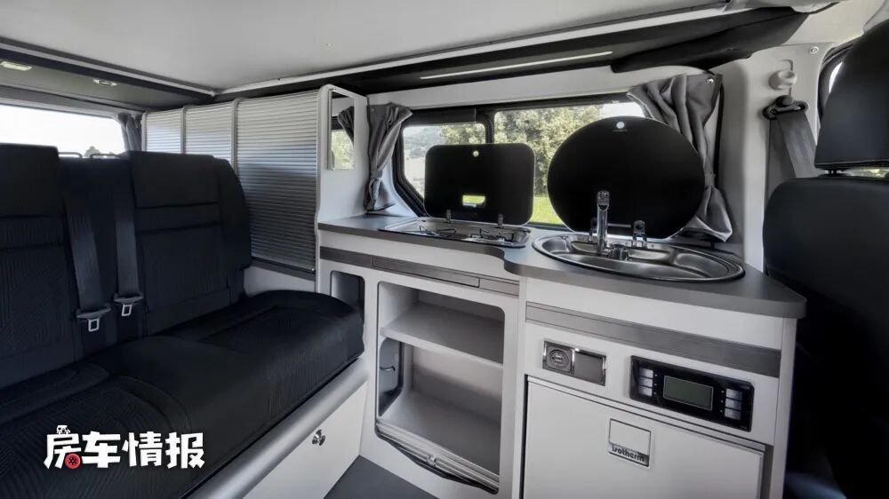 主驾驶座椅后方是全车的厨房操作台,台面上平时可以备菜,翻起盖板,可以看到下方的双孔燃气灶以及大尺寸的不锈钢水槽,台面下放置则提供了储物空间以及一台49L的车载冰箱,可以满足简单的烹饪需求。厨房区后方是带有卷帘门设计的储物柜,满足日常的基本储物需求。