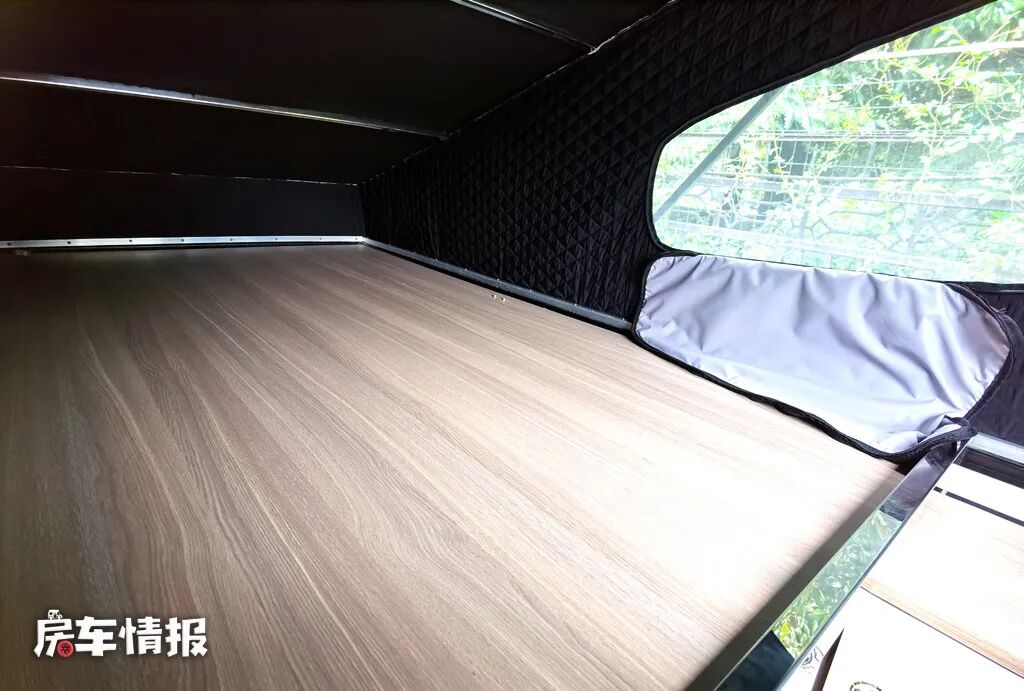 因为整辆车带有升顶机构,所以把升顶打开后,还可以看到内部同样提供了一张可容纳两个人使用的升顶双人床,所以这辆车最多可以容纳5-6人居住。