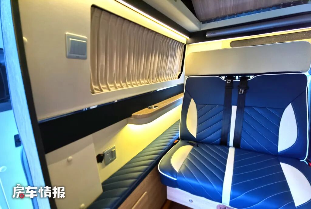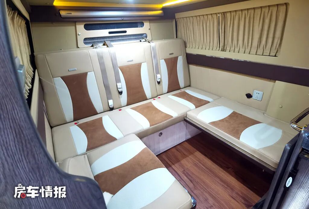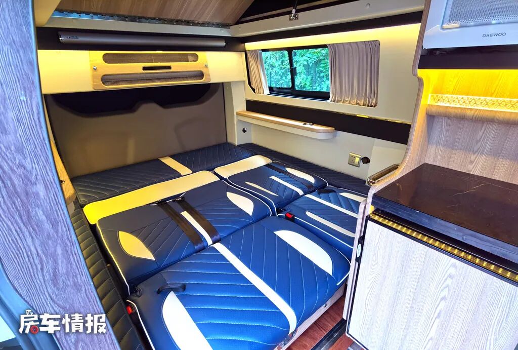 晚上需要休息的时候,就可以将乘客座椅放倒,拓展成一张可容纳两个成年人或一家三口使用的双人沙发床,在床尾的顶部还配置了一台家用变频空调,可以按需调节车内的温度,使整车的环境更宜居。