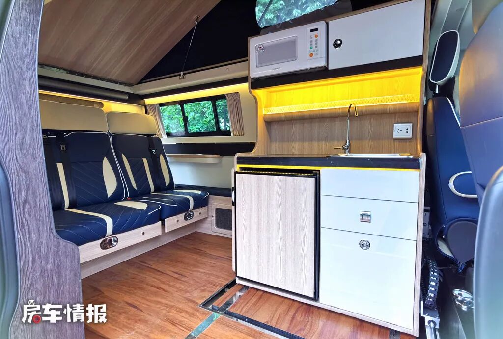 操作台配置了带盖的洗菜盆、66L车载冰箱以及微波炉,因为侧面壁板提供电源插座,也可自行加装便携式电磁炉或者卡式炉,用来满足基本的烹饪需求。