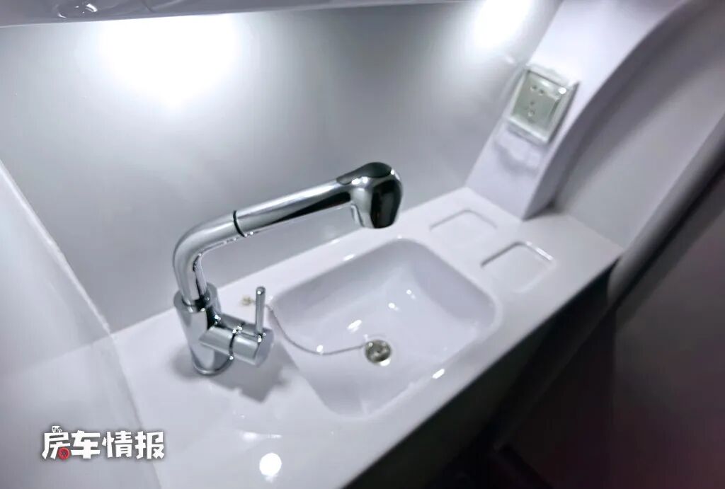打开隐藏在后方的卫浴室,可以看到内部提供了洗手台盆、抽拉式的淋浴花洒以及便携式马桶,也能够满足最基本的洗漱需求。