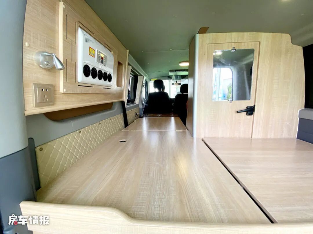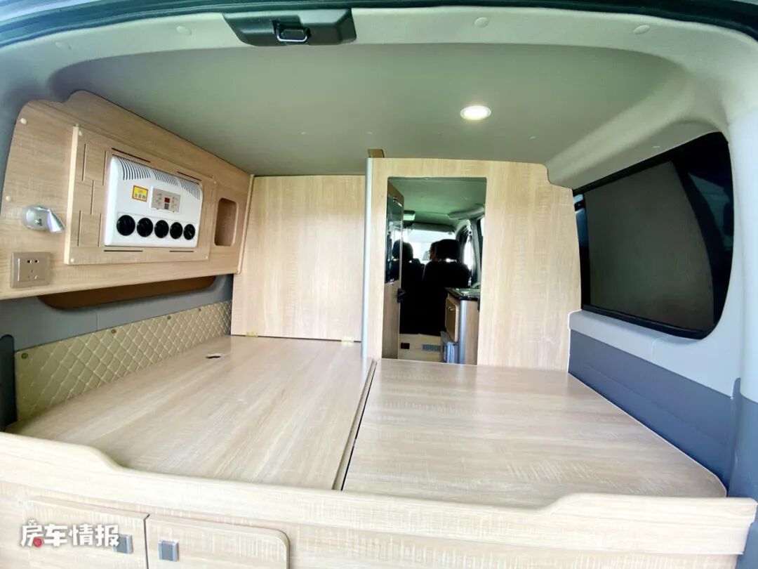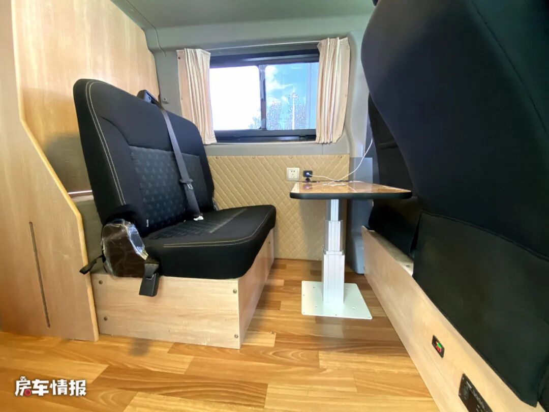 另外一张床铺就是将前方的乘客座椅放倒后形成的,尺寸为1800*900mm,一横一竖两张床铺正好可以满足两个人使用,所以这同样是一辆适合两个人使用的房车。